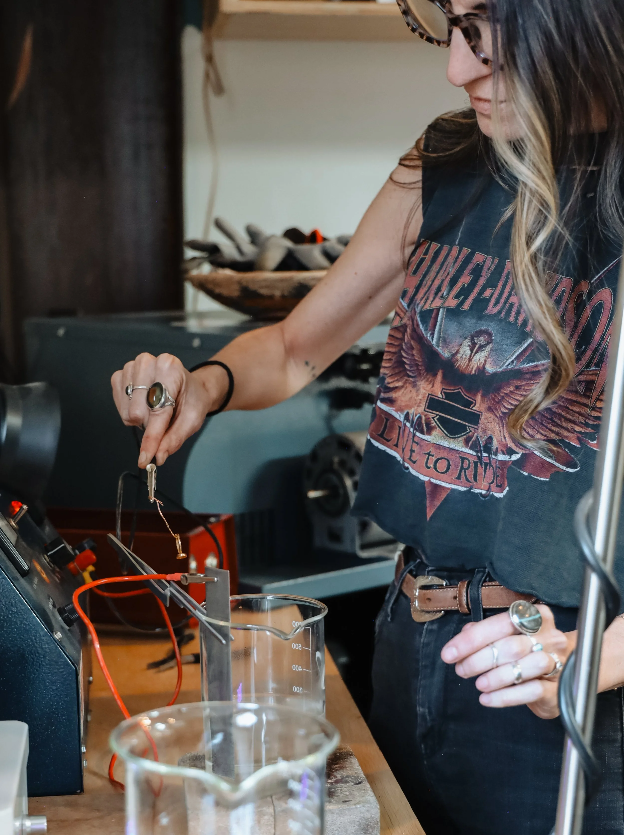 In the studio, the transformation happens right before your eyes. Within just a few minutes, silver can be turned into a 14k or 18k gold finish.